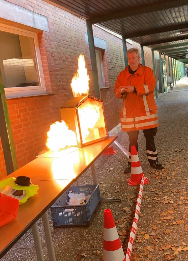 Feuerlöschübungen: Mit Unterstützung der Feuerwehr erlernten die Teilnehmenden den sicheren Umgang mit Feuerlöschern und Löschdecken und trainierten die Brandbekämpfung in verschiedenen Szenarien.